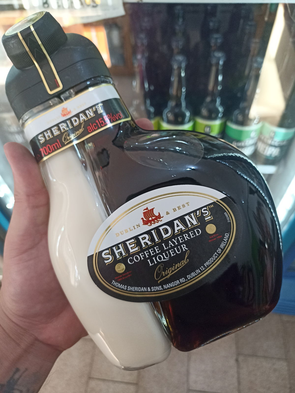Sheridan's es un licor irlandés premium (15.5% alc/vol) reconocido por su botella única de dos compartimentos. Combina licor de café con whisky irlandés envejecido y licor de crema de chocolate blanco. Al servirse, crea capas que asemejan un café irlandés, ofreciendo un sabor dulce y cremoso, ideal para tomar con hielo