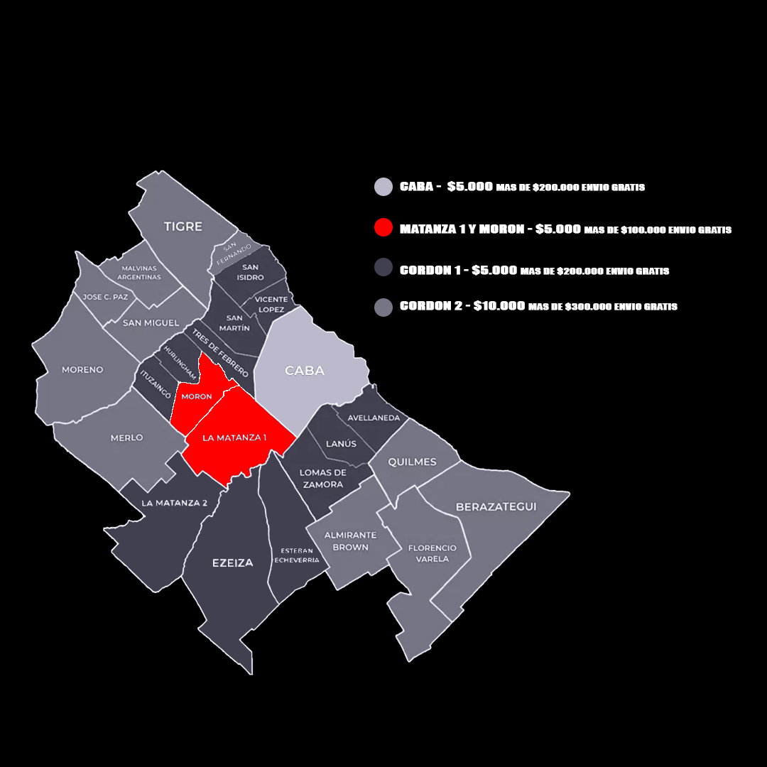 Acá te dejamos nuestras zonas de reparto y sus respectivos costos de logistica. Además también tenemos minimos de compra para poder llevarte el pedido son costo.